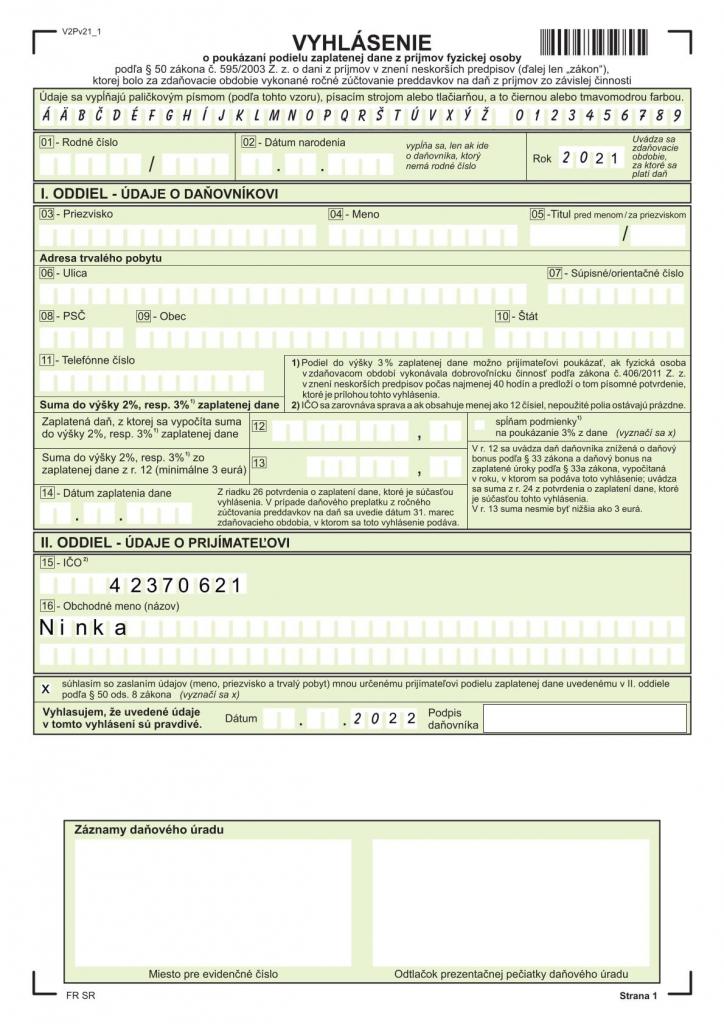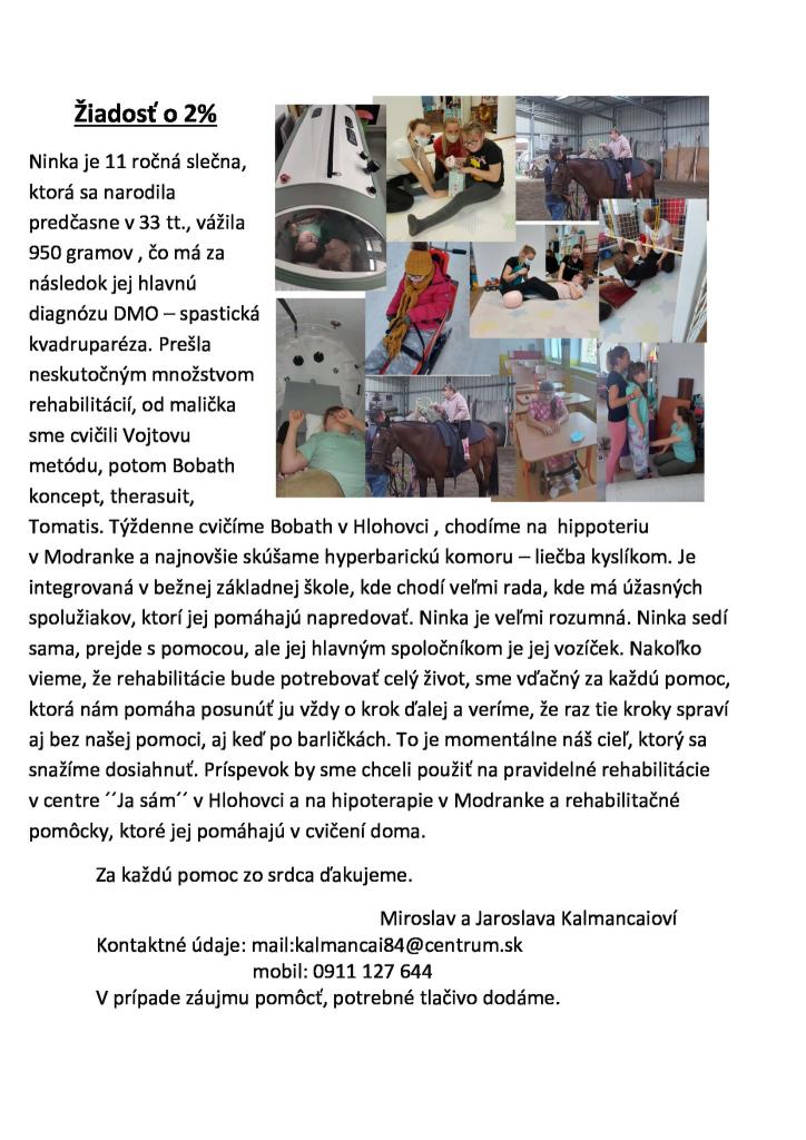 Aj tento rok, by sme Vás chceli z celého srdca požiadať o Vašu pomoc a to darovaním Vašich 2 % z daní pre našu bojovníčku Ninku na rehabilitácie, ktoré sú potrebné na skvalitnenie jej života. ĎAKUJEME