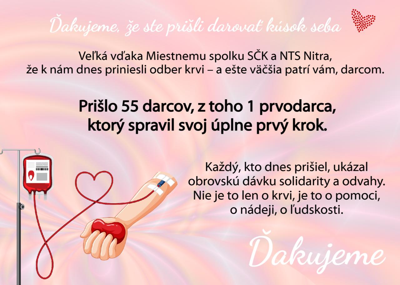 Ďakujeme MS SČK a NTS Nitra za organizáciu a neúnavnú podporu tejto život zachraňujúcej aktivity. Ďakujeme všetkým 55 darcom, ktorí sa zúčastnili mobilného odberu krvi z toho aj 1 prvodarcovi.